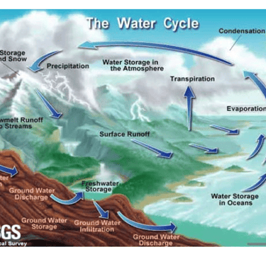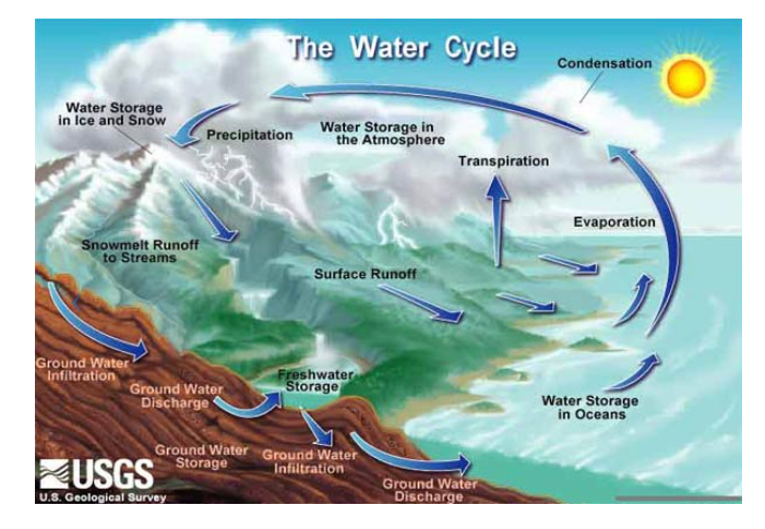 The water cycle, also called the hydrologic cycle, is the cycle by which water continuously circulates from the Earth to the atmosphere and back to the Earth. Many processes, including evaporation, condensation, transpiration, precipitation, and runoff, are involved in the hydrologic cycle.